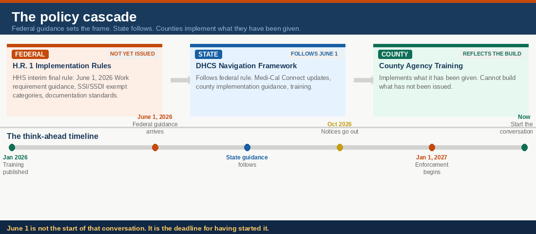 Here is the challenge they were navigating. When that training was published, federal H.R. 1 implementation rules had not been issued. The U.S. Department of Health and Human Services (HHS) interim final rule arrives June 1, 2026, five months after the training was written. The California Department of Health Care Services (DHCS) H.R. 1 Implementation Plan was published January 29, just days before. The Georgetown Center for Children and Families confirmed as of February 1 that the Centers for Medicare & Medicaid Services (CMS) had issued no system modification guidance. The policy framework governing SSI/SSDI transitions had not been written.