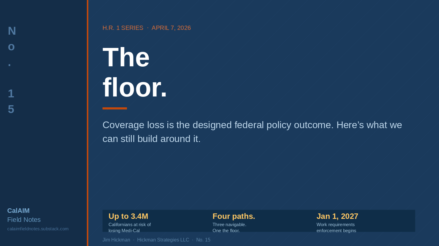 For Path D: document who lands there. Track what happens, the deferred care, the emergency visits, the Section 17000 programs being rebuilt from three enrolled members. Build the evidence base that makes the policy argument to Sacramento and to Congress. Make sure the safety net knows Path D is coming.