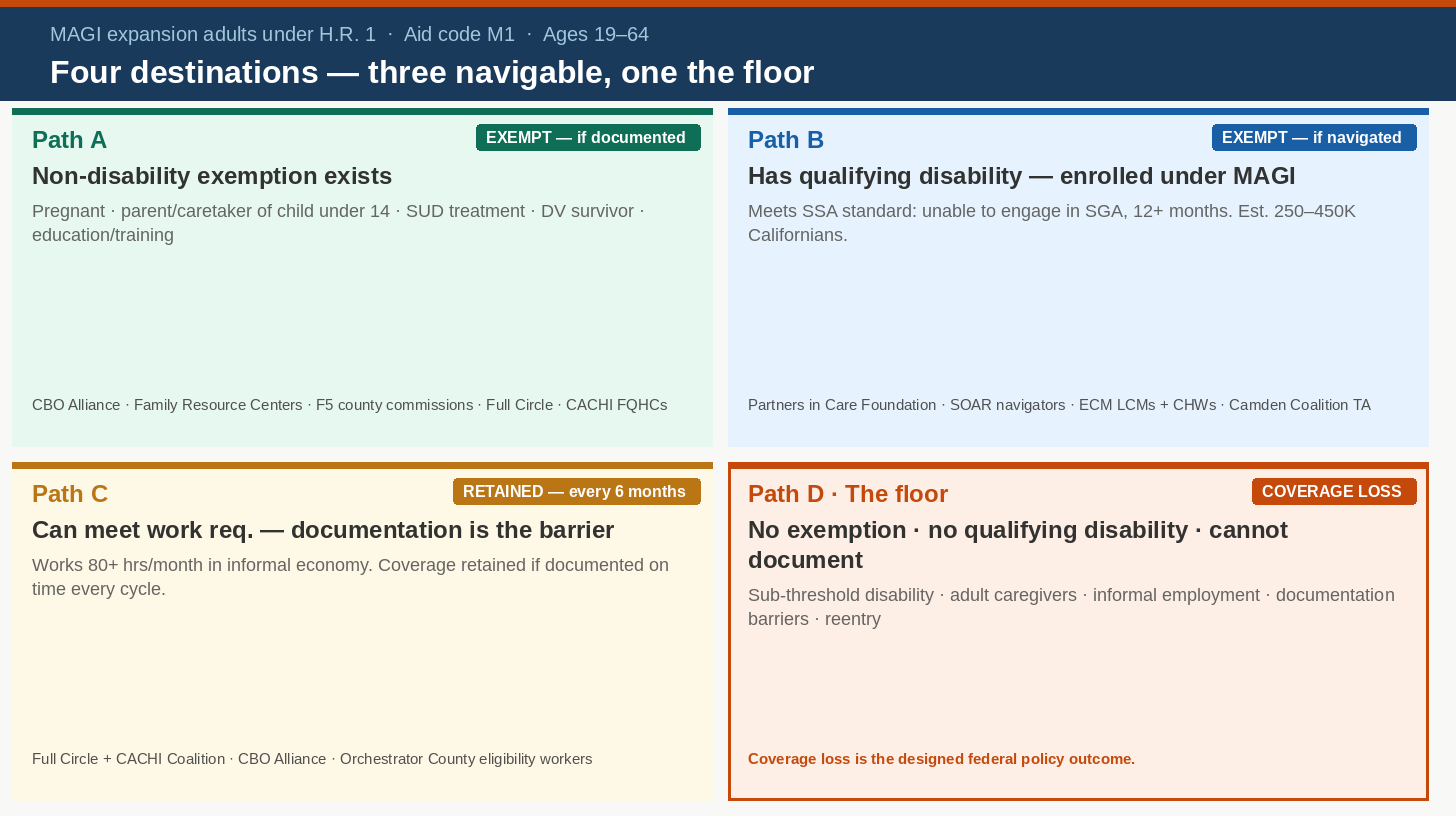 Every MAGI-enrolled Californian facing work requirements will end up in one of four places. Three are navigable. One is the floor.