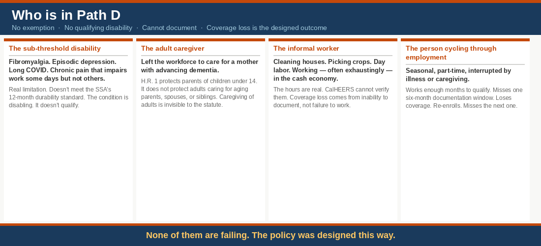 For Path D, coverage loss is the designed federal policy outcome. Not a documentation failure. The designed outcome.