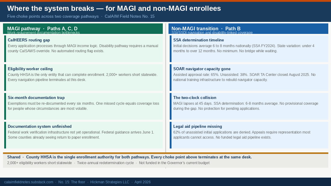 How large is Path B? The disability-qualifying MAGI subset is estimated at 250,000 to 450,000 Californians, a working proxy range because no public figure exists. SOAR-assisted SSI/SSDI approval rates run 65%. Unassisted: 38%. That 27-point gap is the value of what was lost.